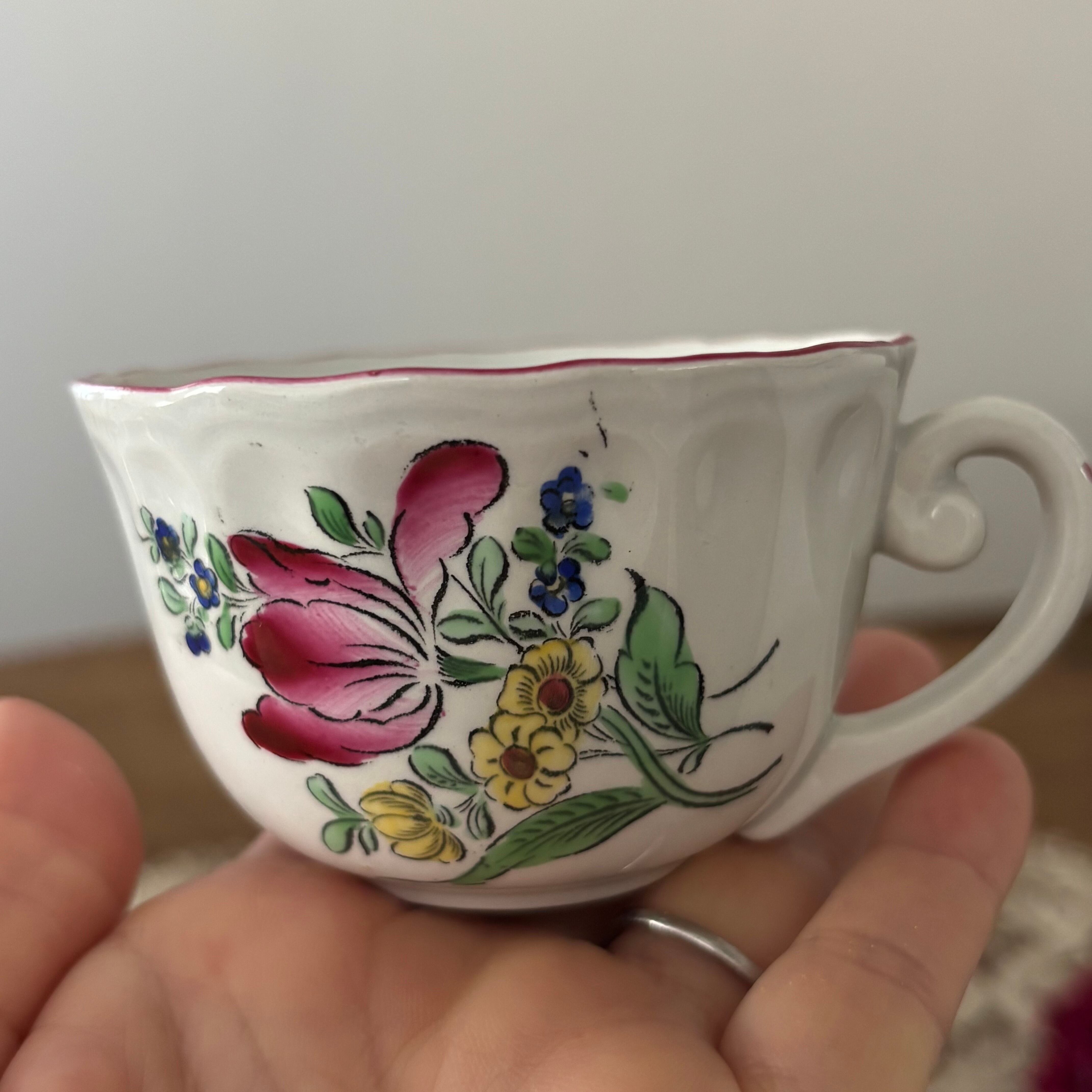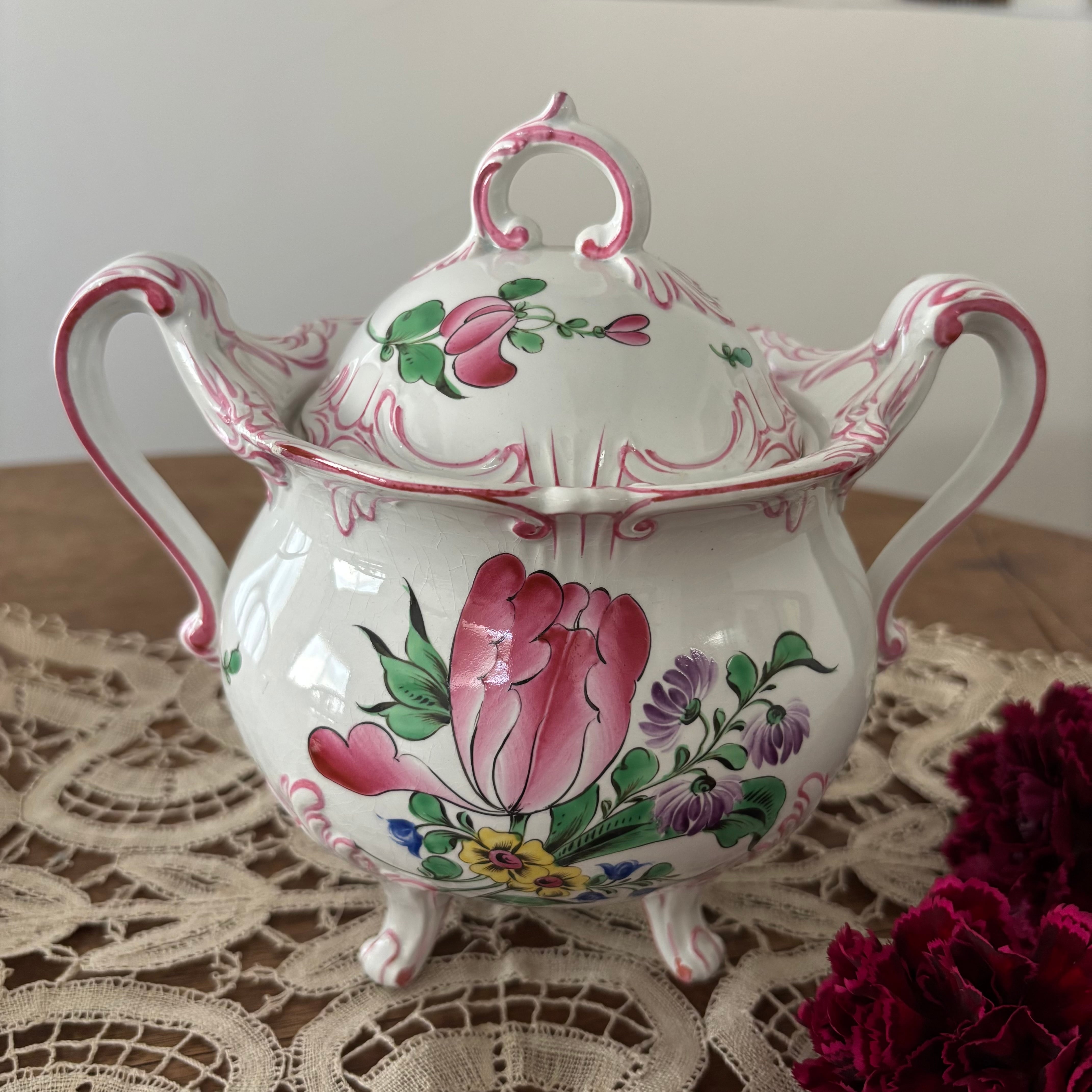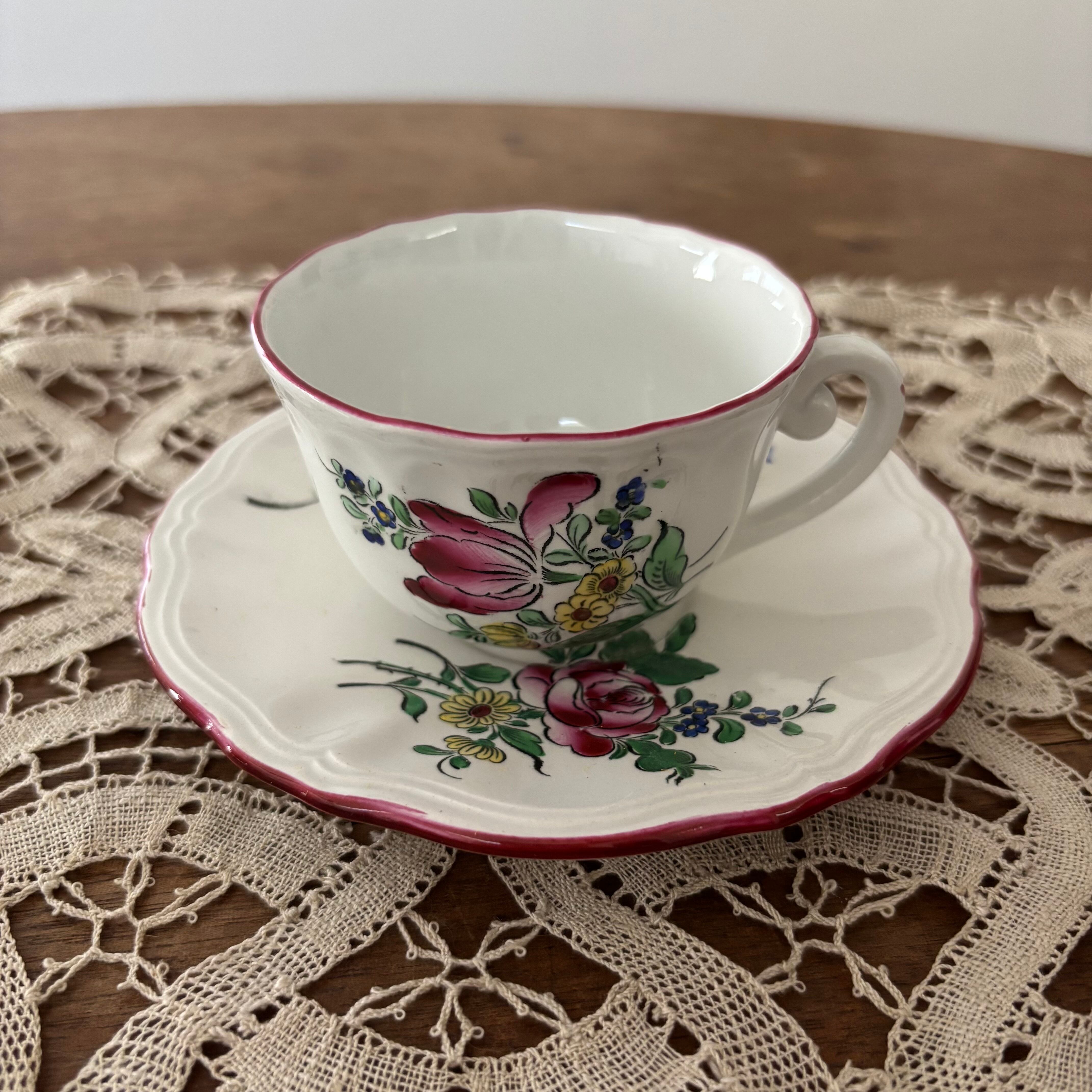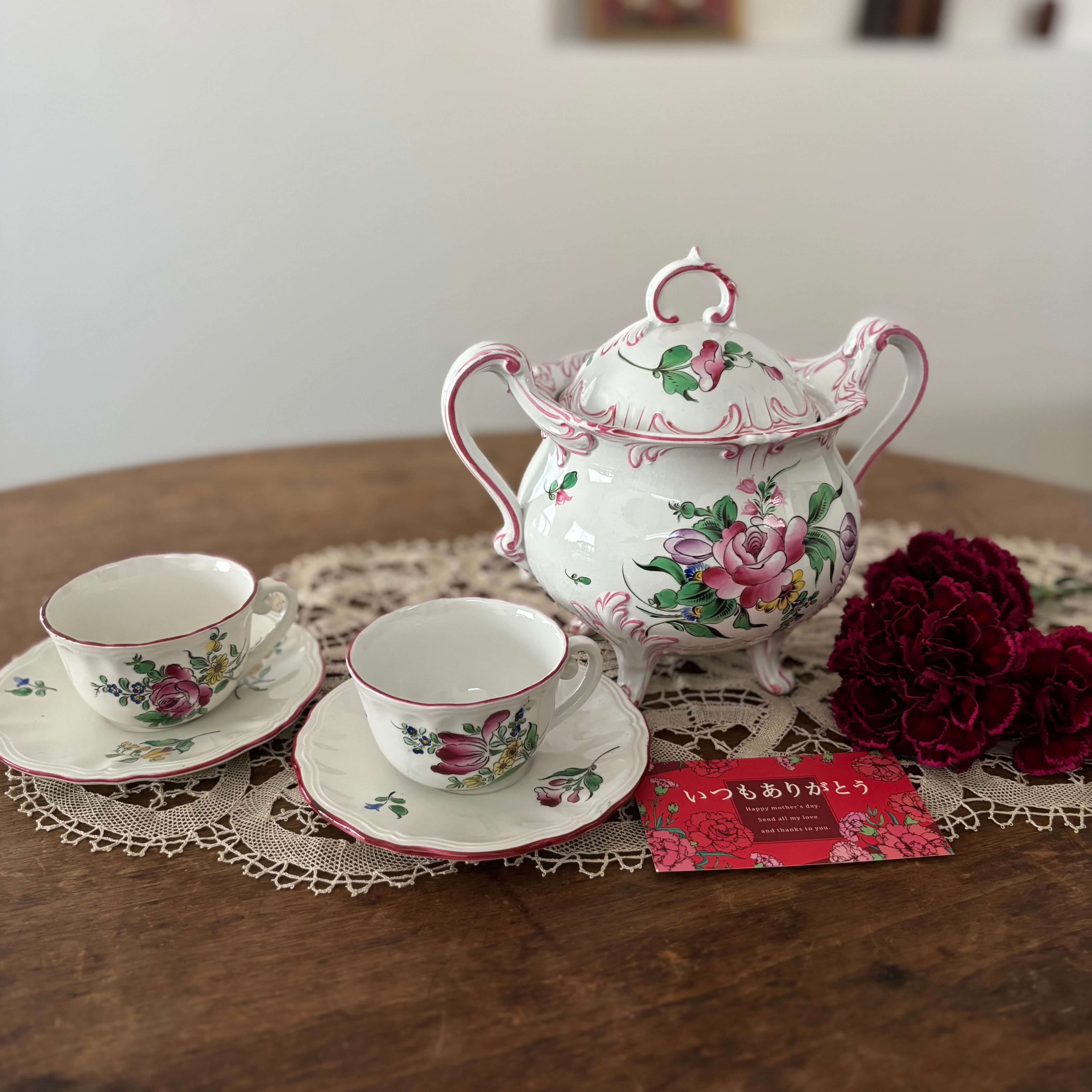 フランスのブロカント蚤の市で購入したリュネヴィルの19世紀後半から20世紀初頭にかけて作られた大変美しいボンボニエール(砂糖菓子入れ)とカップ&ソーサー2客のセットです。