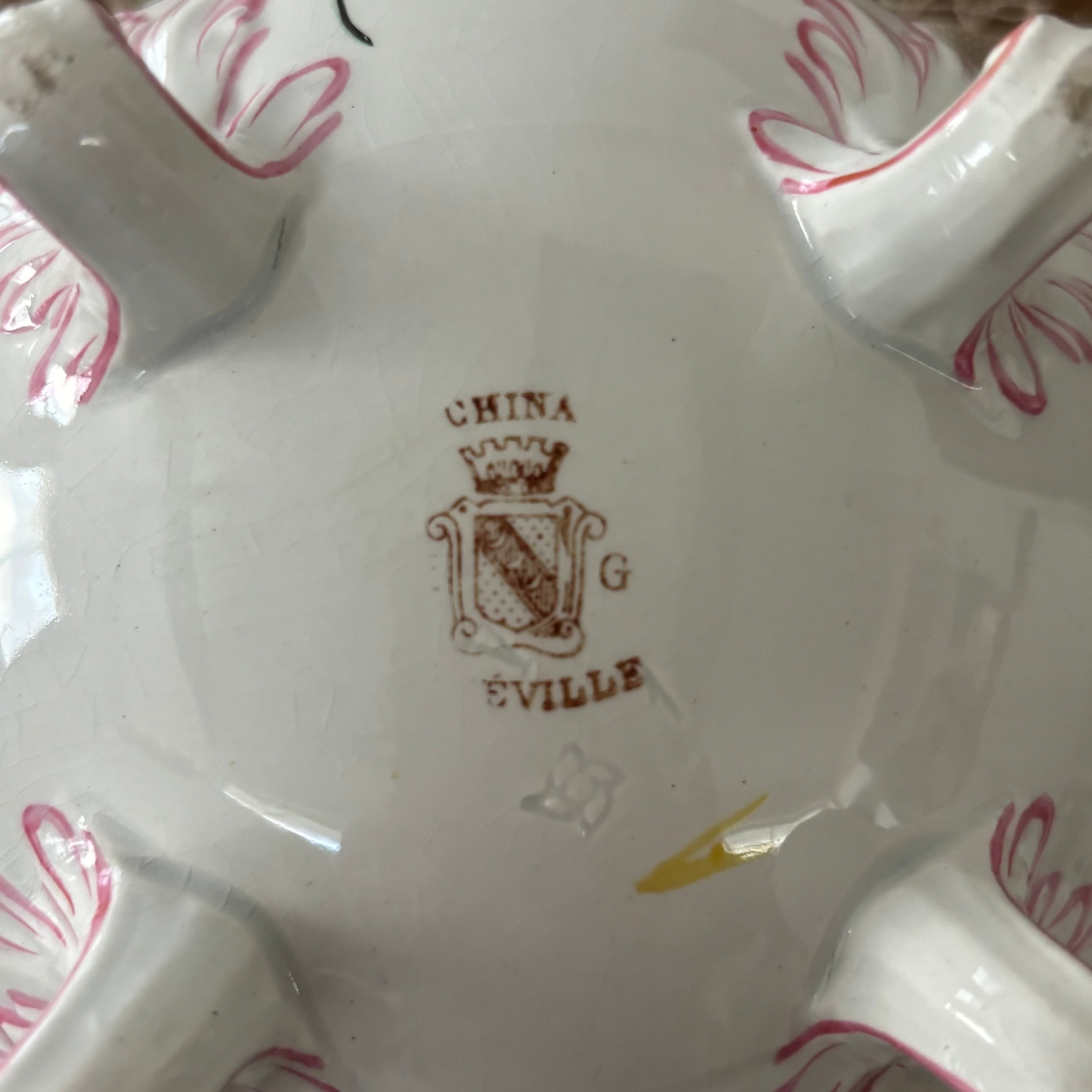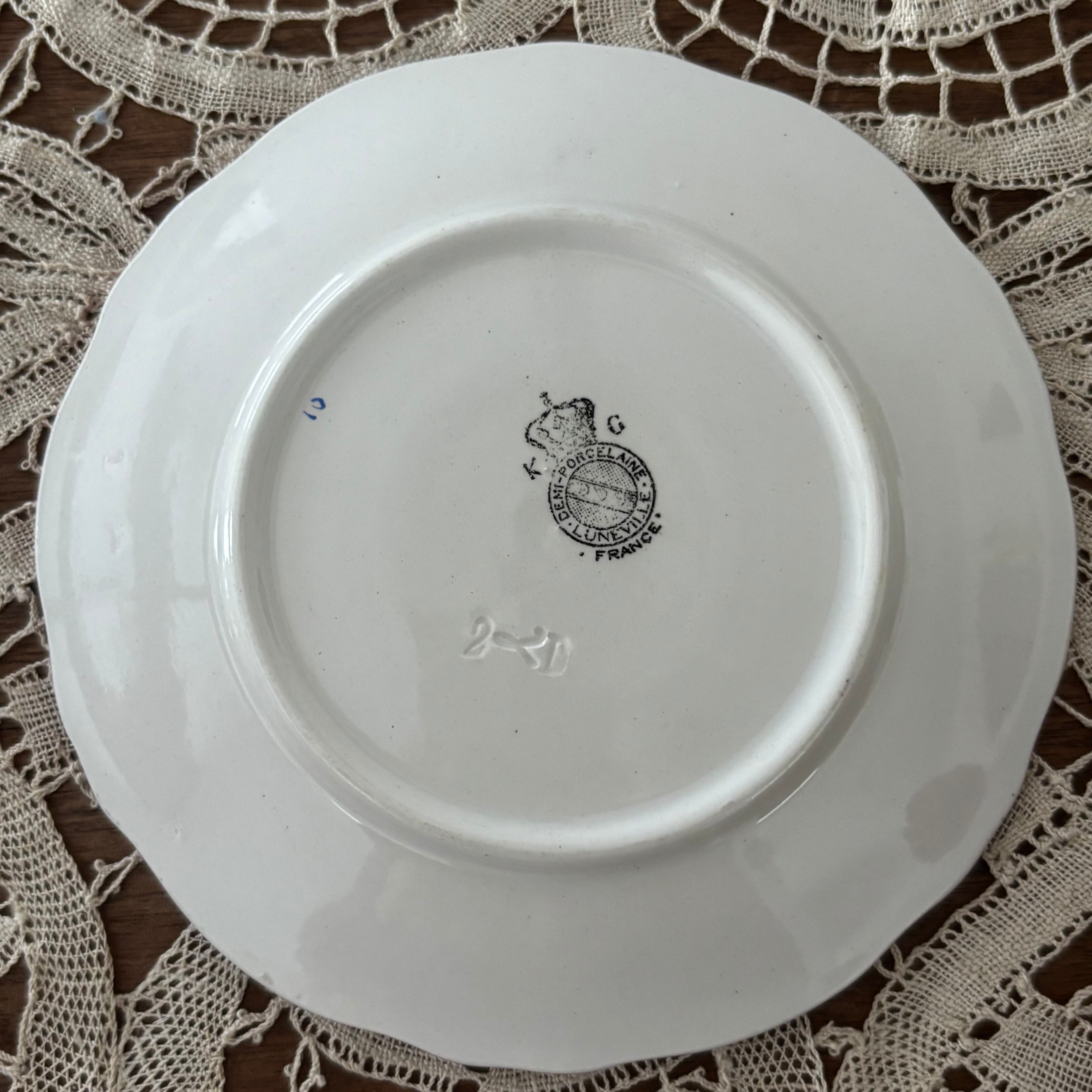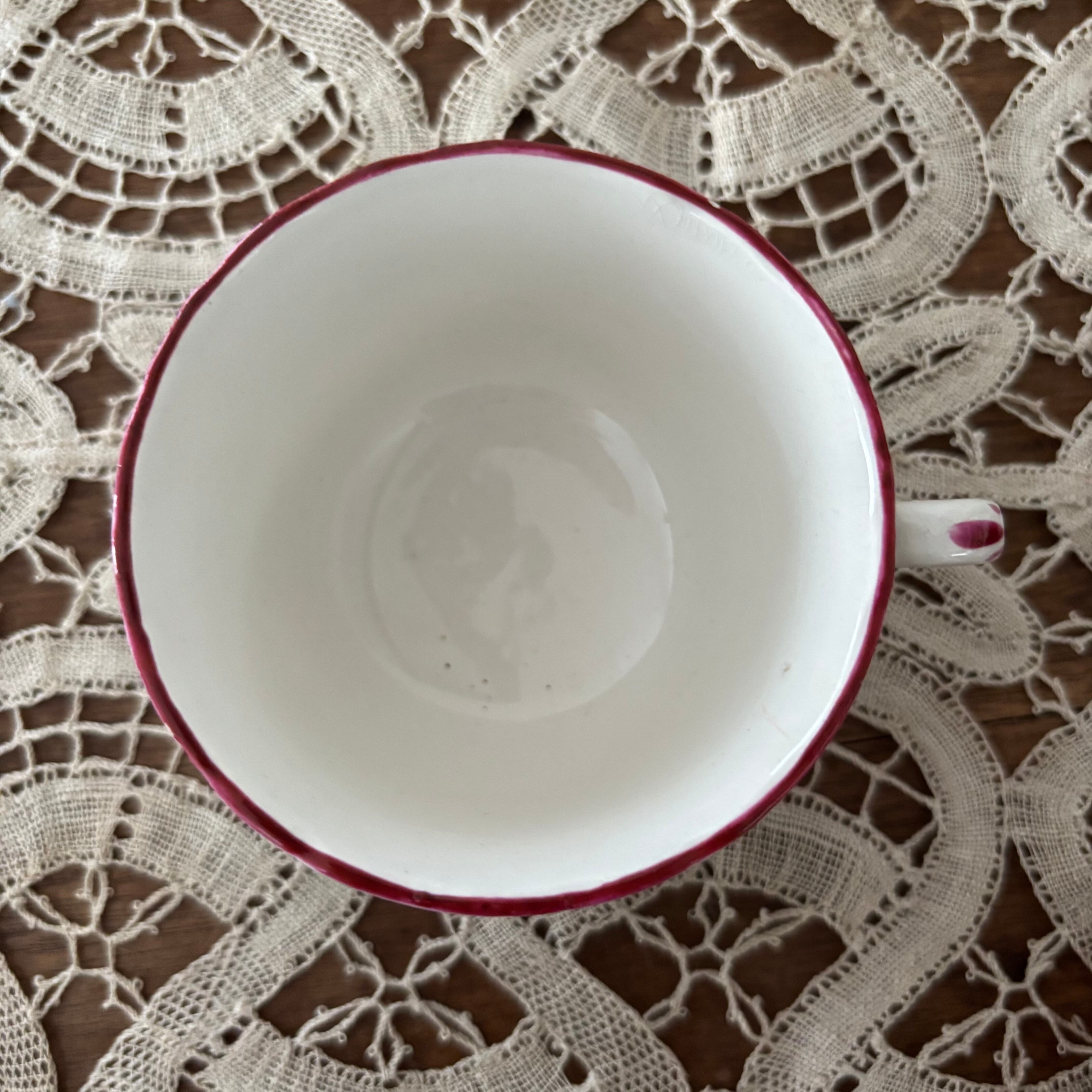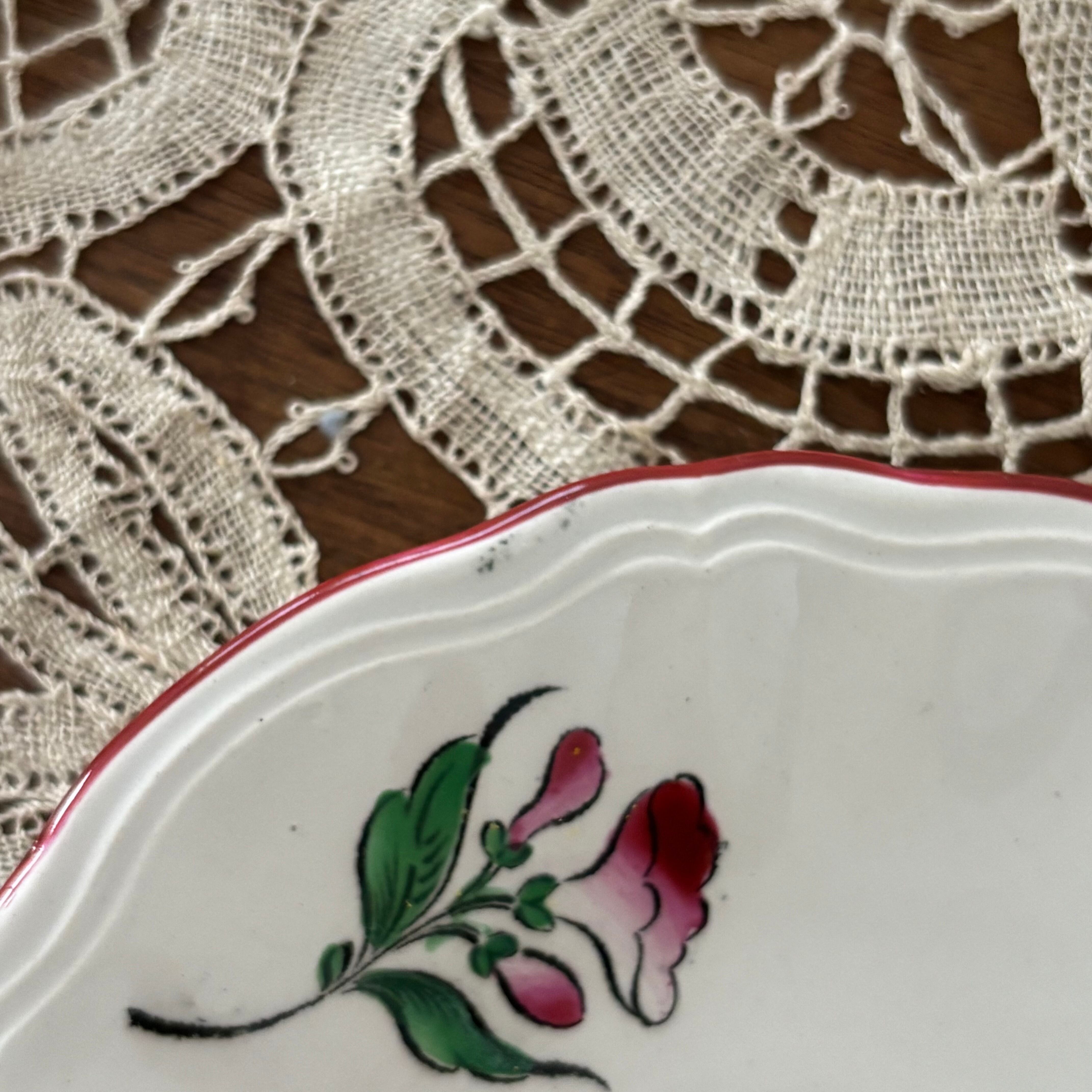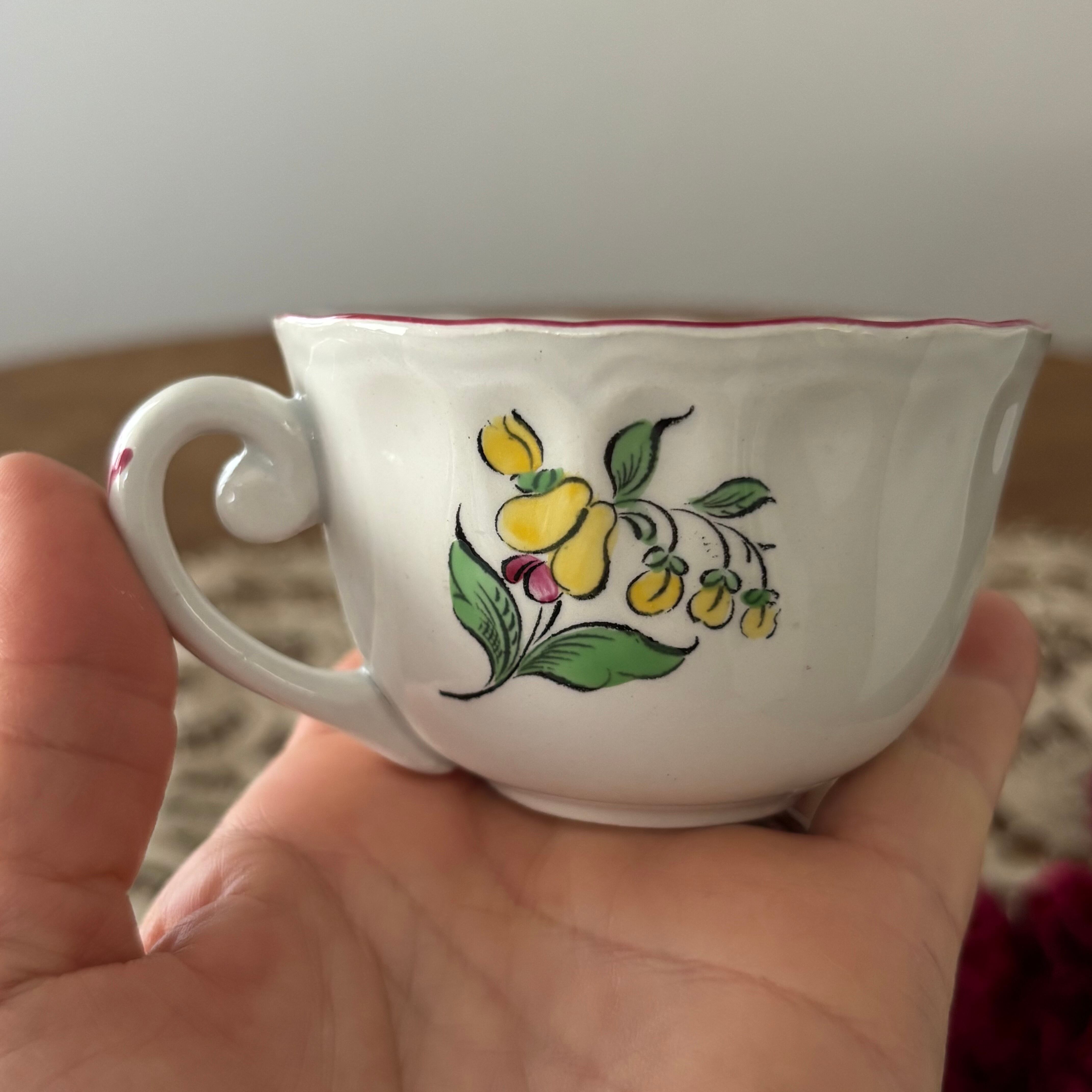フランスのブロカント蚤の市で購入したリュネヴィルの19世紀後半から20世紀初頭にかけて作られた大変美しいボンボニエール(砂糖菓子入れ)とカップ&ソーサー2客のセットです。